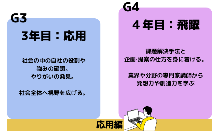3年目は、与えられた社会課題に取り組むことで課題を解決する力をつけていきます。今年はDX化を課題においてます(2022年)。自社の課題を見つめてDX化で解決できないかを探っていくカリキュラムです。
